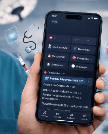 O app funciona como um assistente clínico de bolso, organizado por sistemas (cardiovascular, respiratório, neurológico, emergência, anestesia, oncologia etc.).